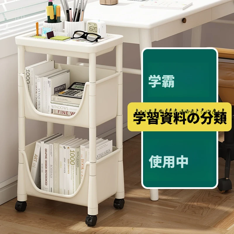 移動式多層書架 - 学生デスク横にぴったり!車輪付きで便利な収納、シンプルなデザインでお部屋をスッキリ整理整頓。書籍や文房具をスマートに収納できます。