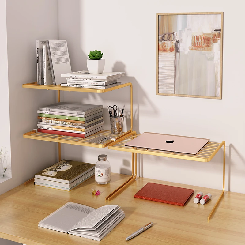 鉄製の多層整理棚 - デスク上の収納に最適!本や小物をスッキリ整理。ベッドサイドや窓際、オフィスデスクにもぴったりのスタイリッシュな置物ラック!あなたの空間を美しく整えます。