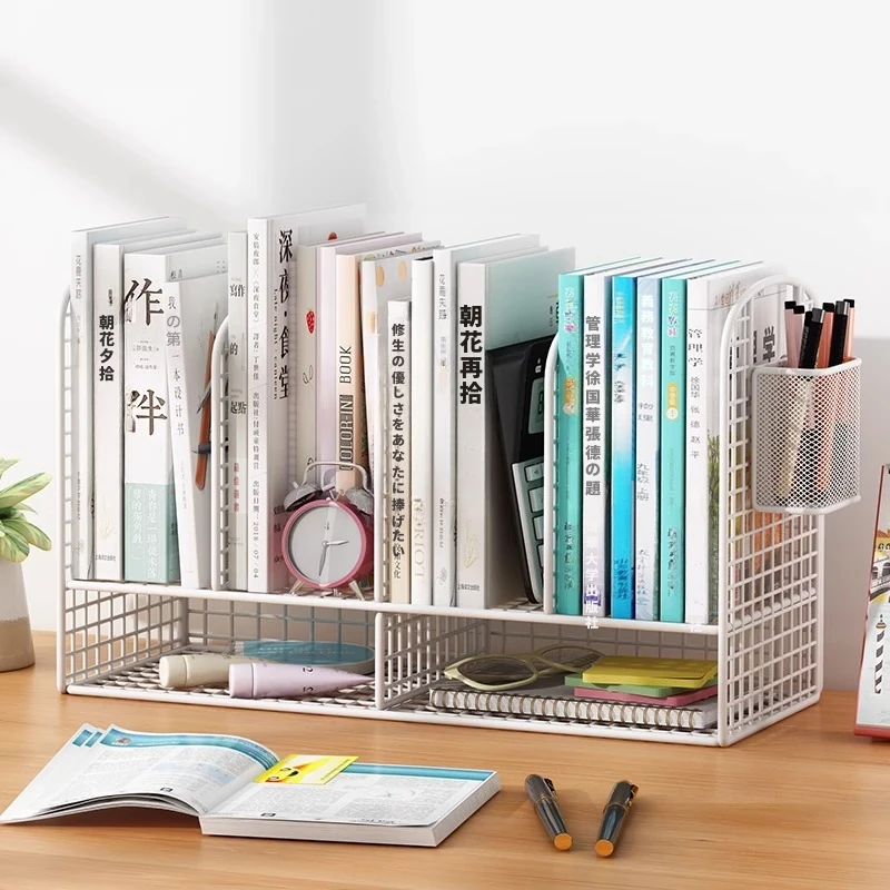 子供部屋にもぴったり!オフィスデスク用のスリムな書棚とデスクトップ収納ラック。ダブルレイヤーの文房具整理ラックで、本やファイルをスッキリ整理。飾り棚としても使える、機能的でスタイリッシュな収納アイテム!