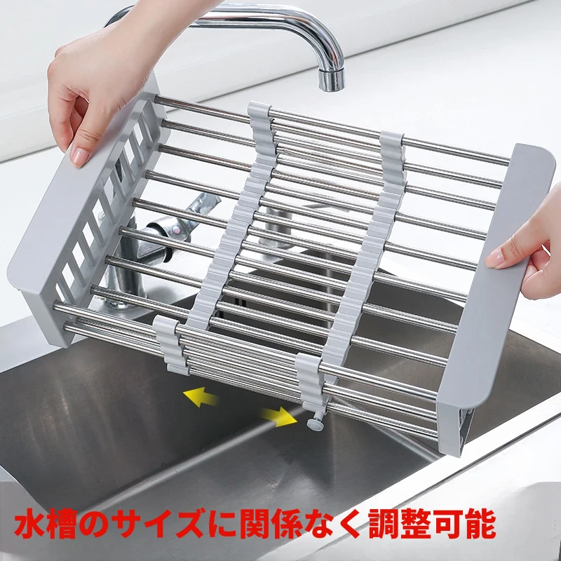 キッチンの水切りスタンド!洗い物のストレスを解消する、伸縮可能なシンク用収納ラック。食材や食器をすっきり整理できるフィルター付き水切りバスケットで、料理の効率をアップさせましょう!