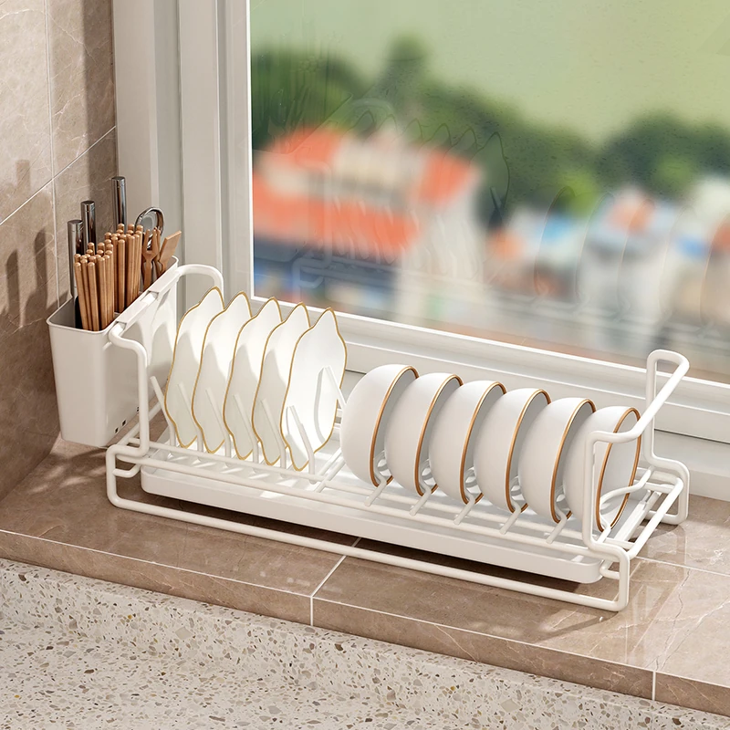 窓辺にぴったり!スリムな皿立て・食器収納ラック - キッチンカウンターのスペースを有効活用!水切り機能付きで、整頓された美しいキッチンを実現します!