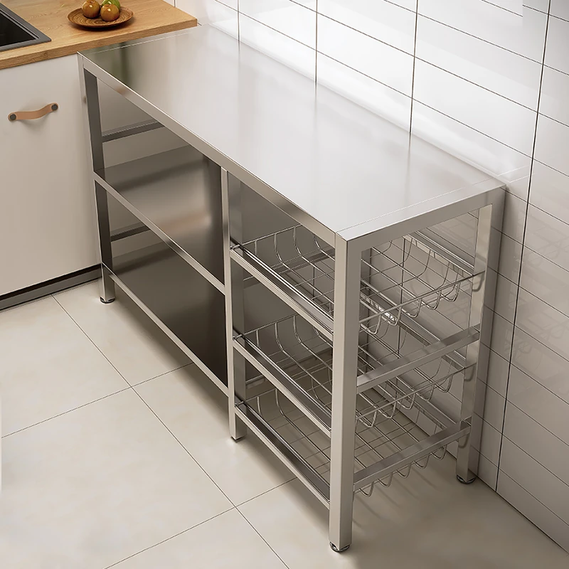 キッチン収納ラック|電子レンジ・鍋具用マルチ収納|野菜カゴ・カッティングワークテーブル|ステンレス製のスリムテーブルでスペースを有効活用!おしゃれで機能的なキッチンを実現!