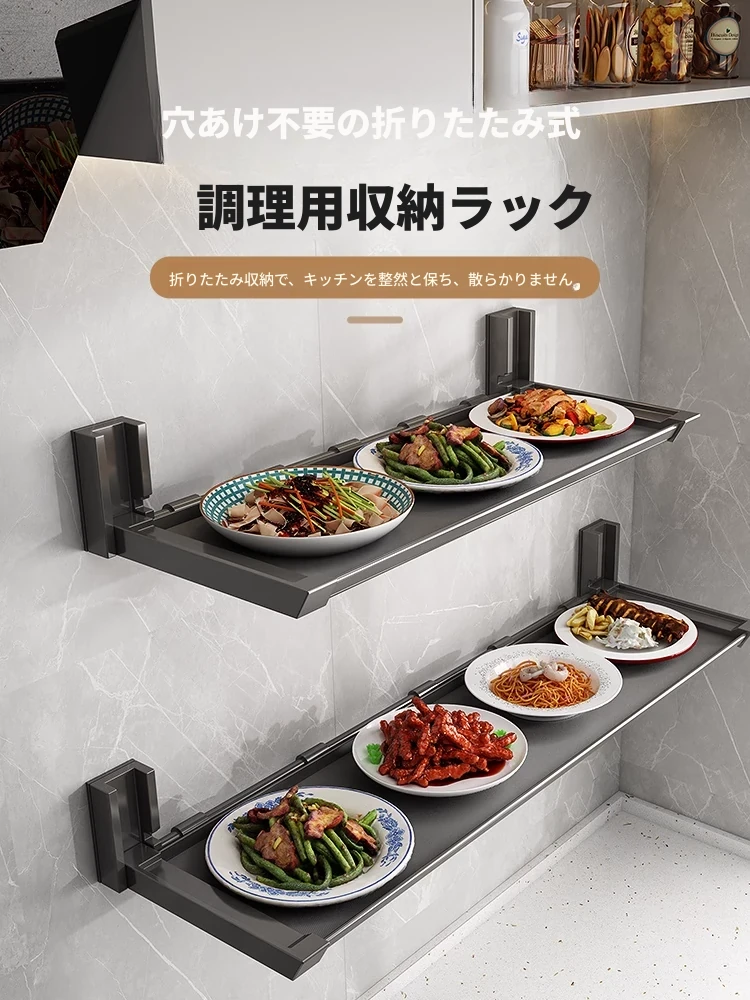 キッチン用折りたたみ式壁掛け収納ラック - 穴あけ不要で簡単取り付け!多機能な皿・調味料収納に最適なアイテムで、スッキリ整理整頓!
