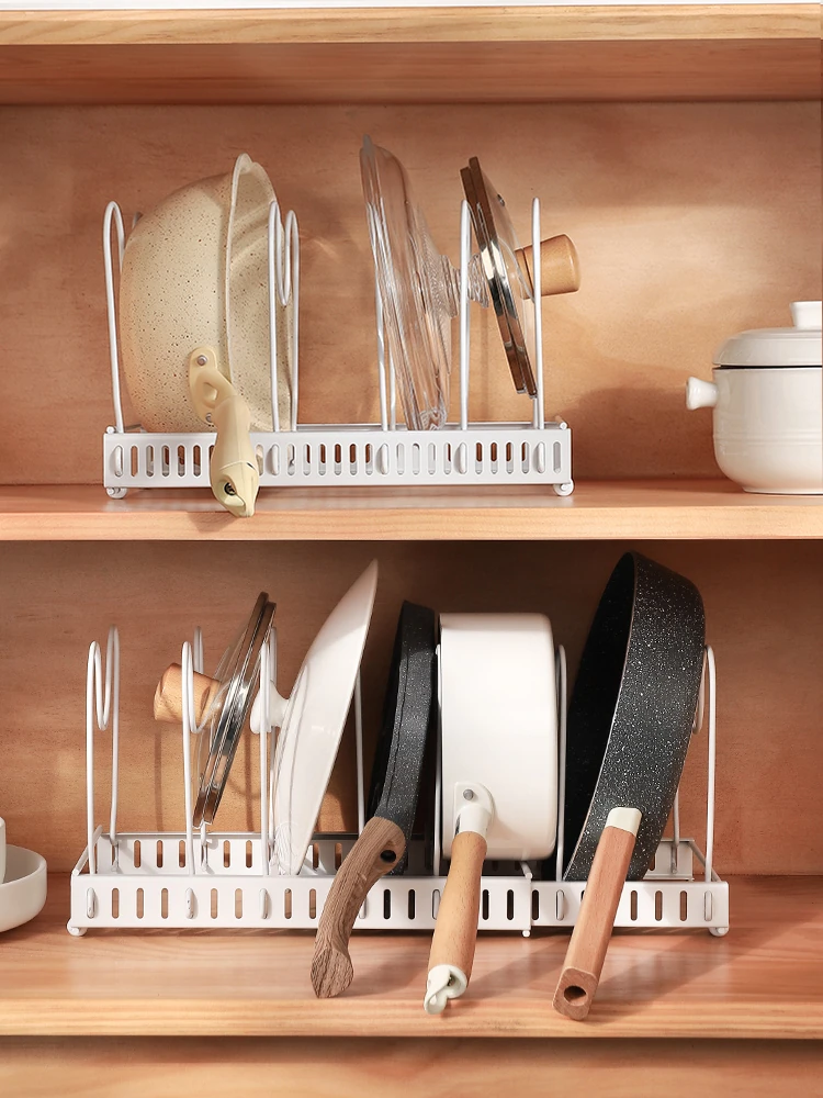 調整可能なキッチン鍋スタンド・収納ラック - クローゼット内の鍋や調理器具をスッキリ整理!テーブル上の皿や鍋蓋もおしゃれに収納。あなたのキッチンをもっと使いやすく!