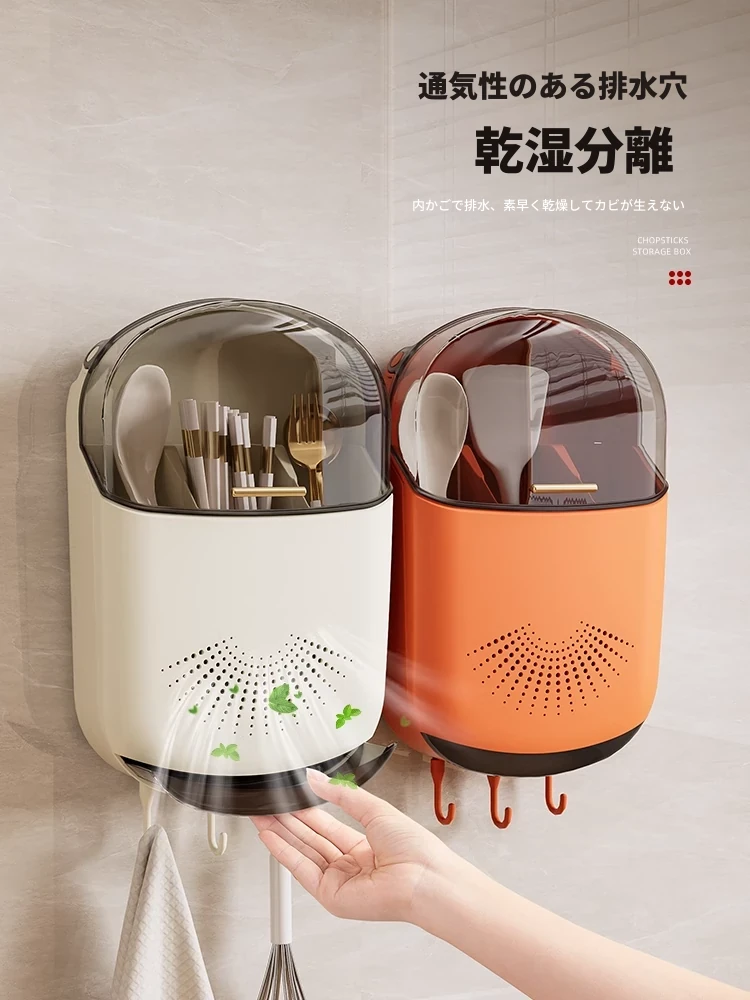 キッチン用防塵壁掛け箸立て|新型箸・スプーン収納ボックス|穴あけ不要の便利な収納ラック!清潔感あふれるデザインで、キッチンがスッキリ!