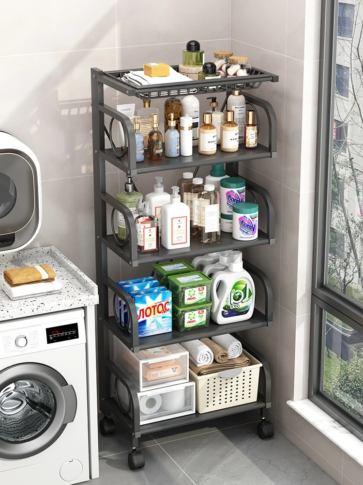多層可移動トイレ収納ラック - 洗濯機横にぴったり!洗剤や小物をスッキリ整理!狭い隙間にもフィットする便利なアイテムで、おしゃれで機能的なお手洗い空間を演出!