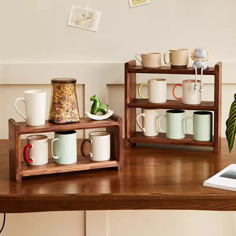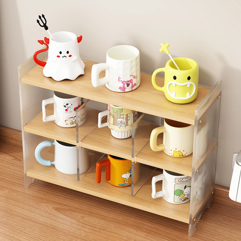 アクリルカップ収納ラック デスク用マグカップ・ティーカップ・コーヒーカップに最適!多層設計でスペースを有効活用。天然木製のスタイリッシュな置物ラックで、おしゃれに整理整頓!
