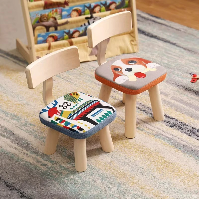 Cute Cartoon Wooden Stool for Kids - Home Use Baby Low Chair with Backrest, Solid Wood Small Bench, Soft Fabric Seat, Perfect for Little Ones!