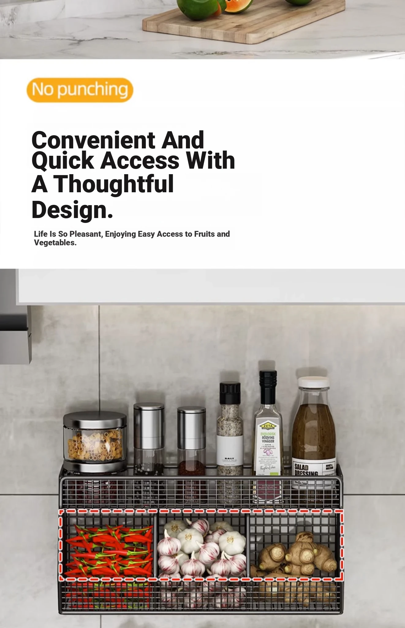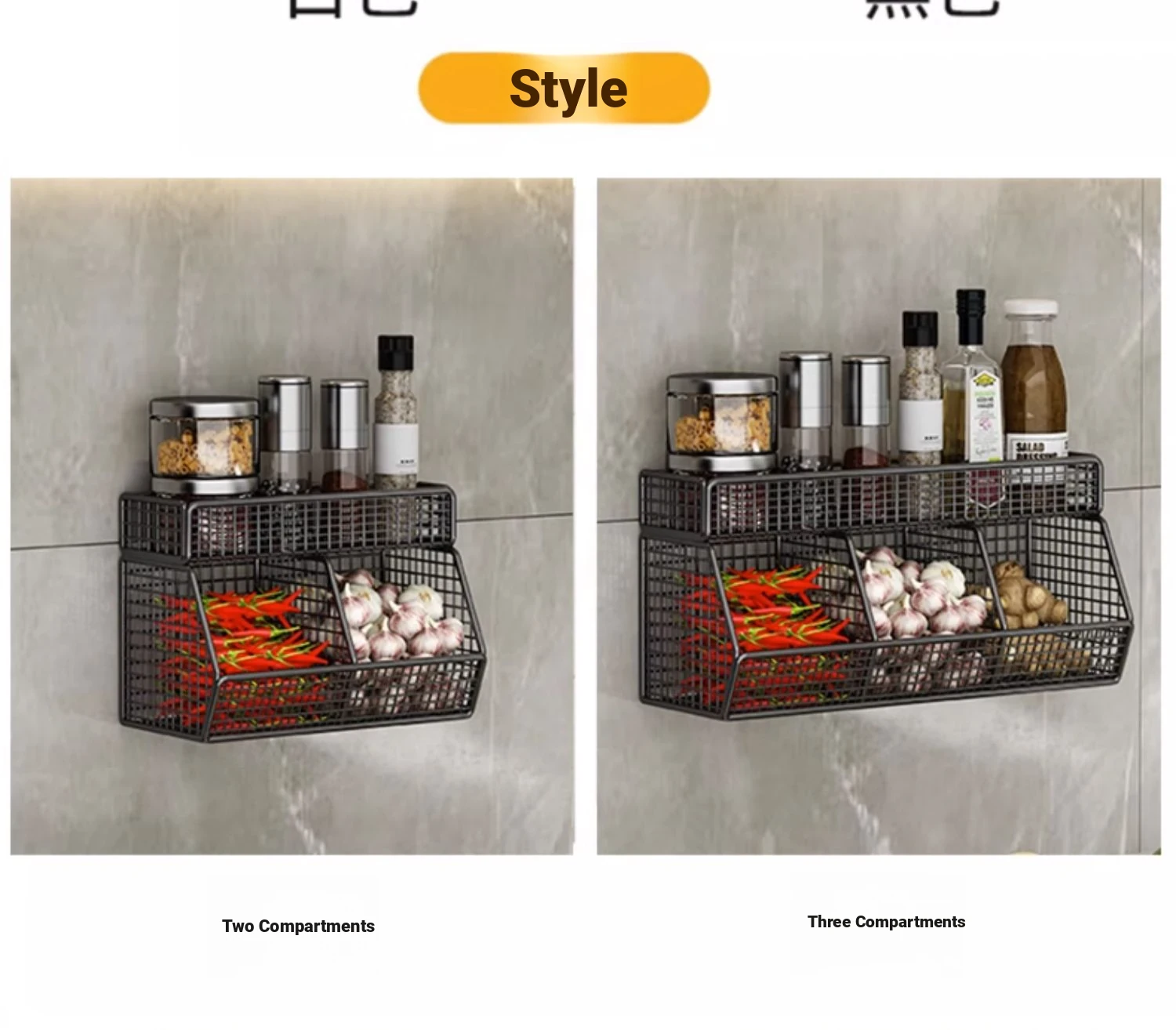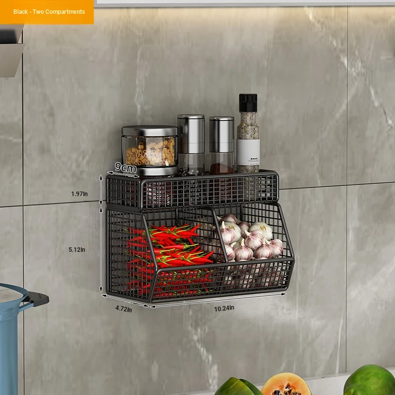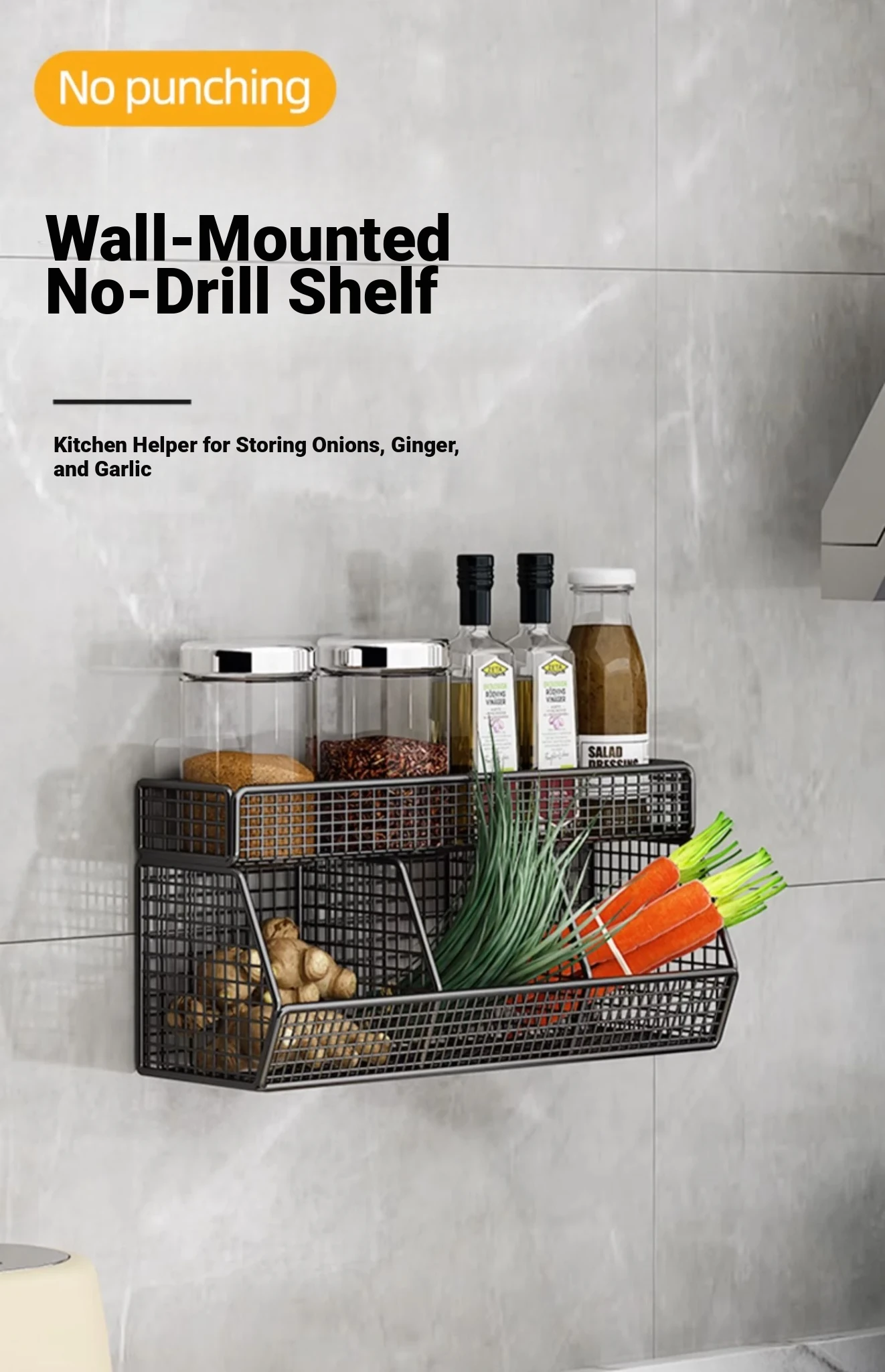 Wall-Mounted Kitchen Storage Rack - Multi-Functional Herb and Spice Organizer for Garlic, Ginger, and Onions - No Drill, Easy Installation - Perfect for Your Seasoning Bottles and Hanging Baskets!
