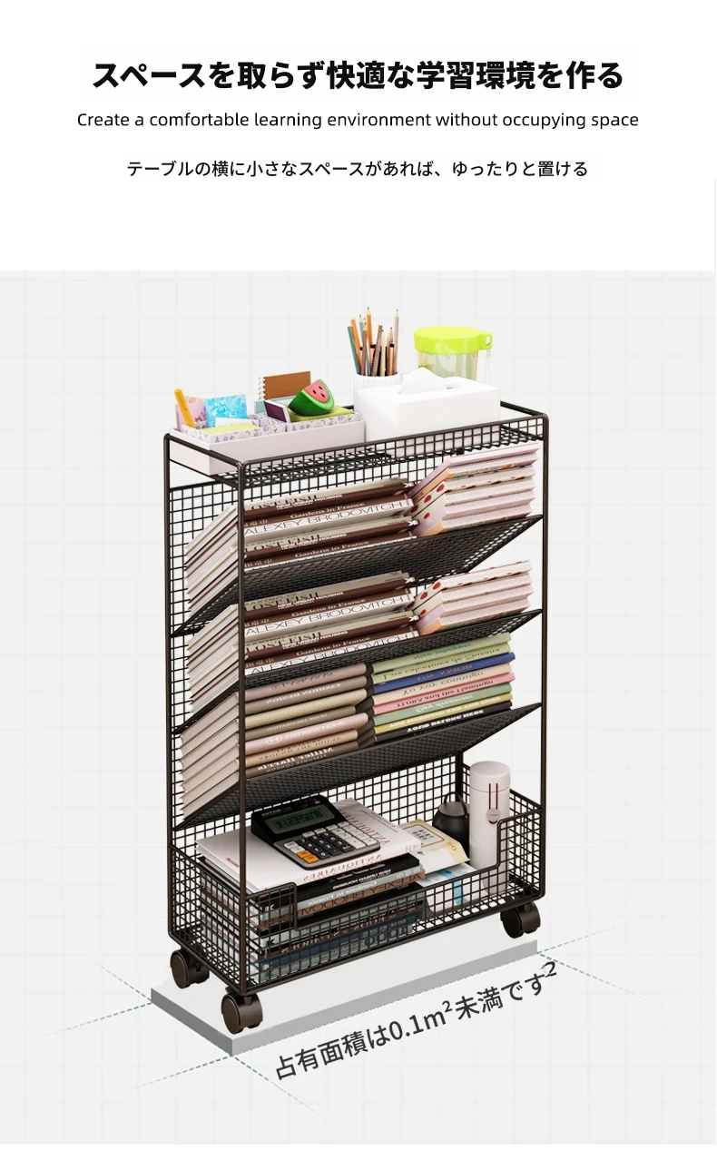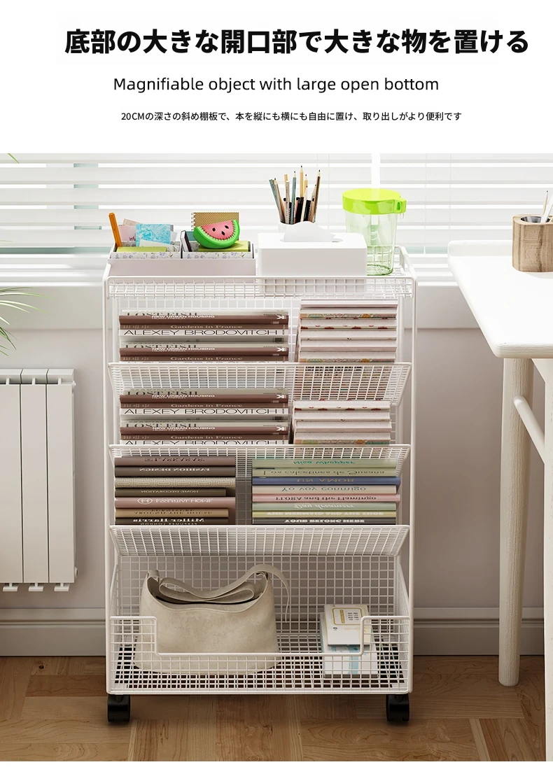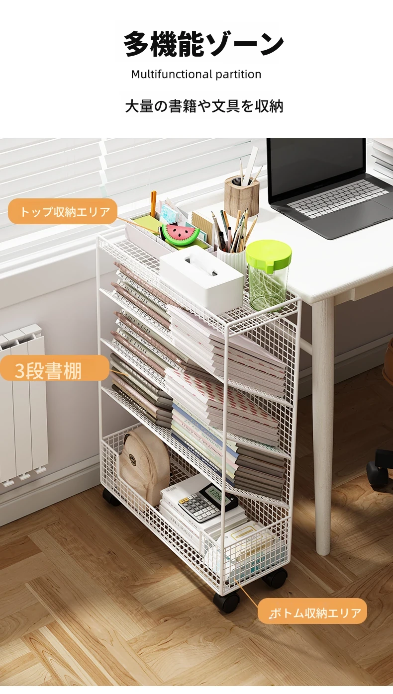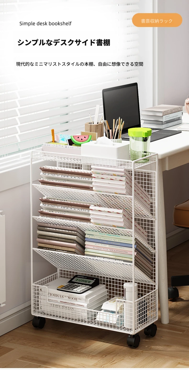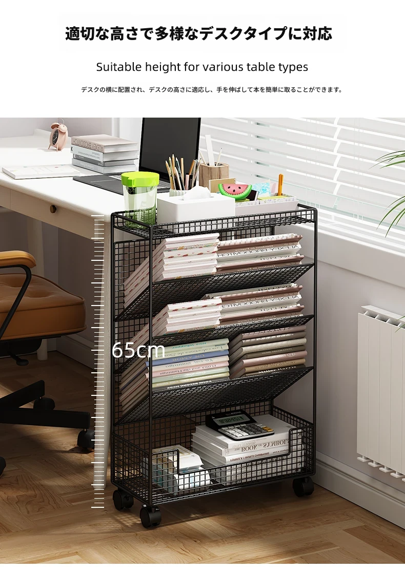 移動式の小型本棚 - 書斎や学習机の横にぴったり!子供用の簡易収納ラック、キャスター付きでラクラク移動可能。お部屋をスッキリ整理整頓し、楽しい読書タイムを実現!