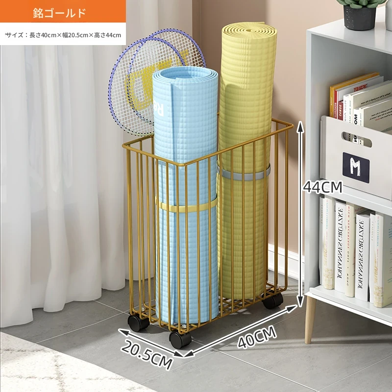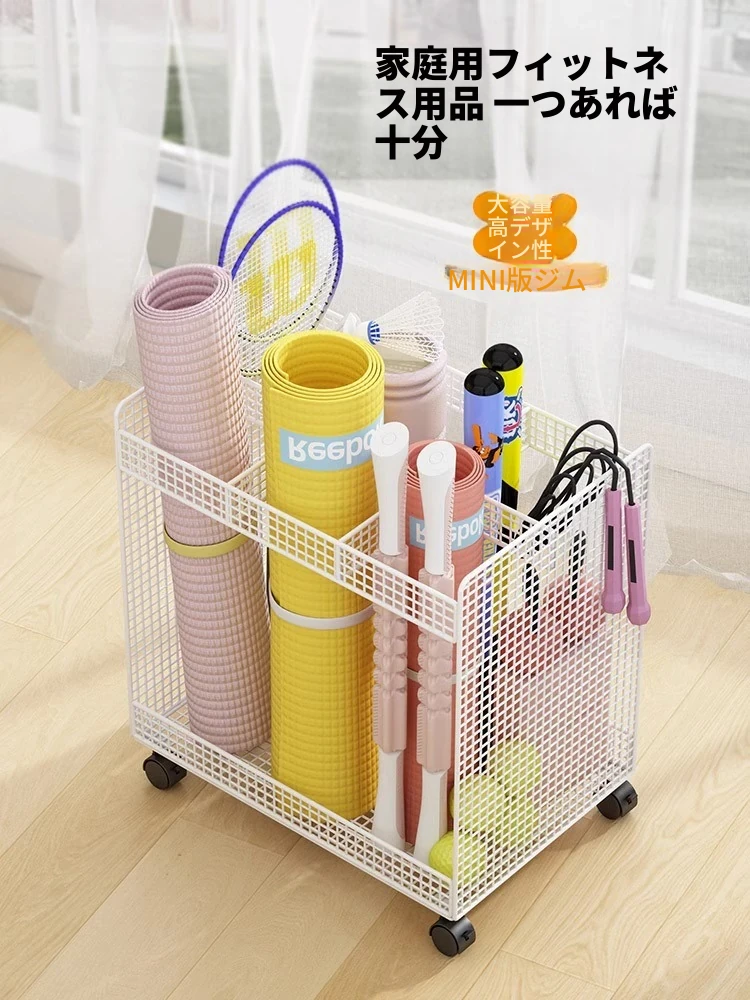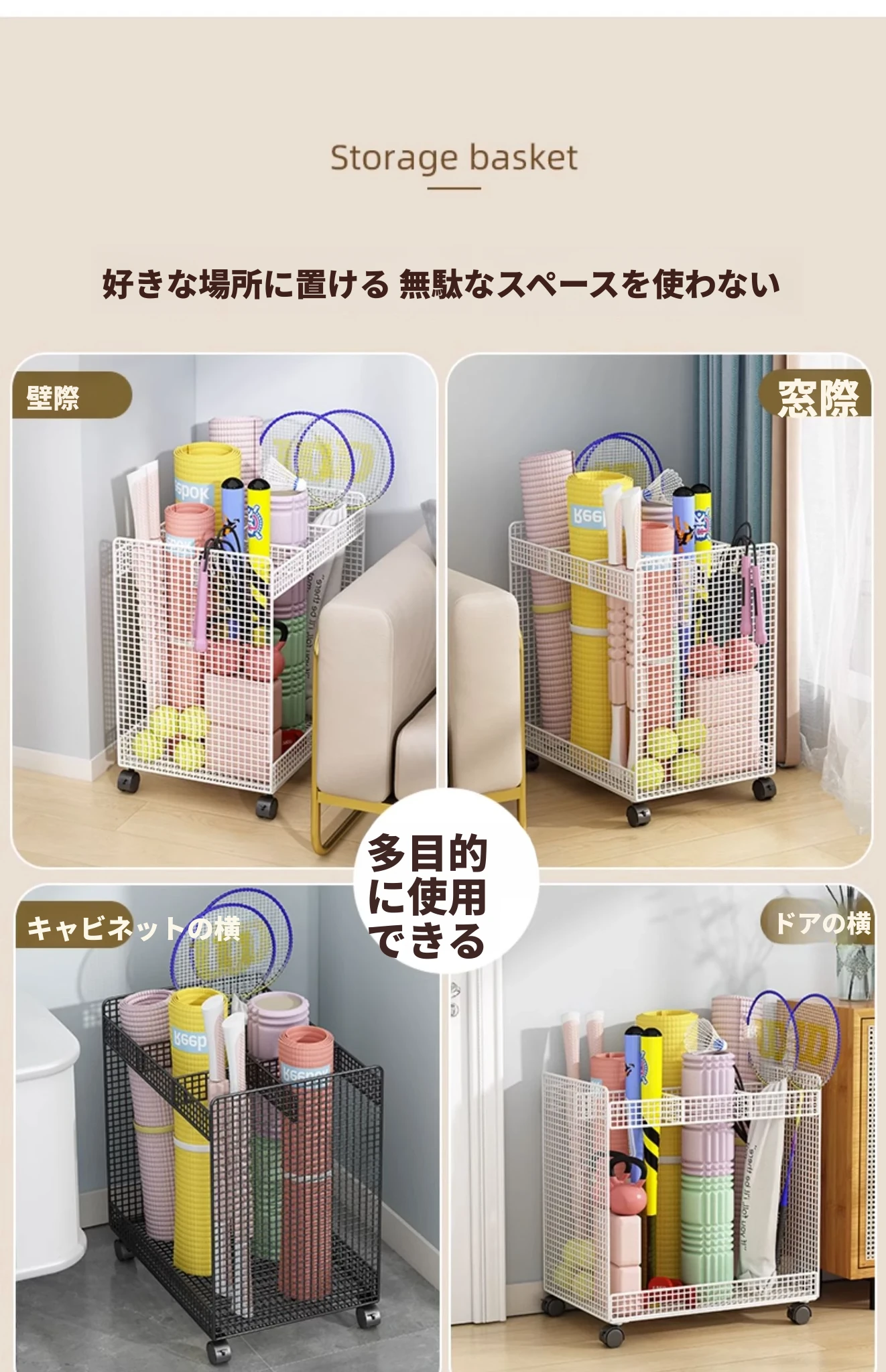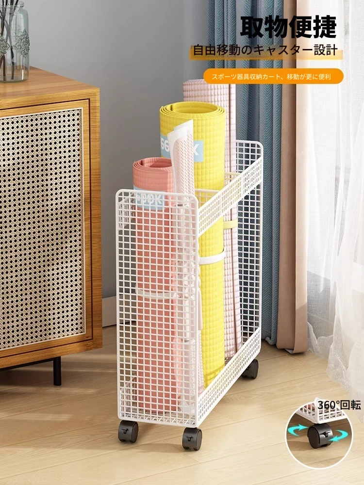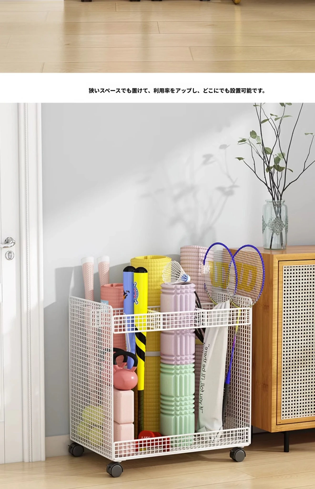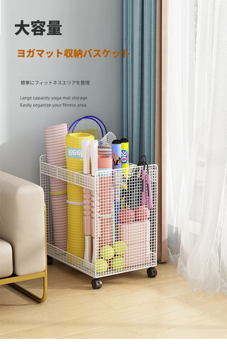 ヨガ収納バスケット 車輪付きフィットネス器具収納ラック フォームローラー用ツールバスケット 家庭用折りたたみスリム棚 すっきり整理して、快適なトレーニングスペースを実現!