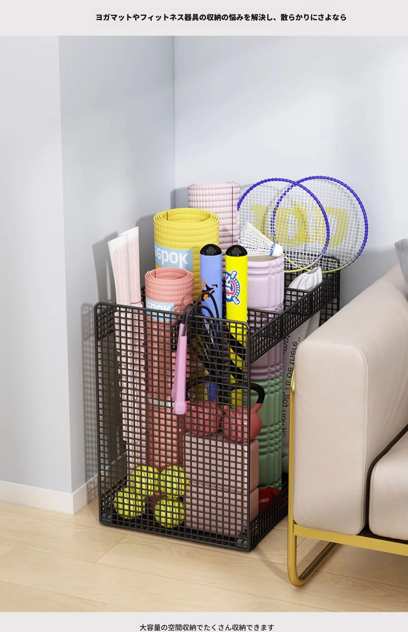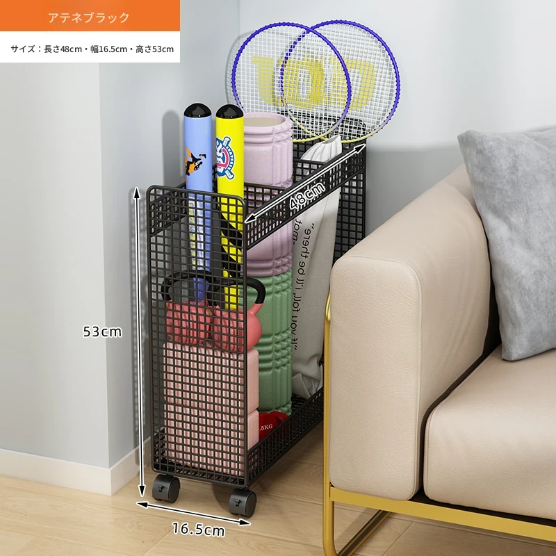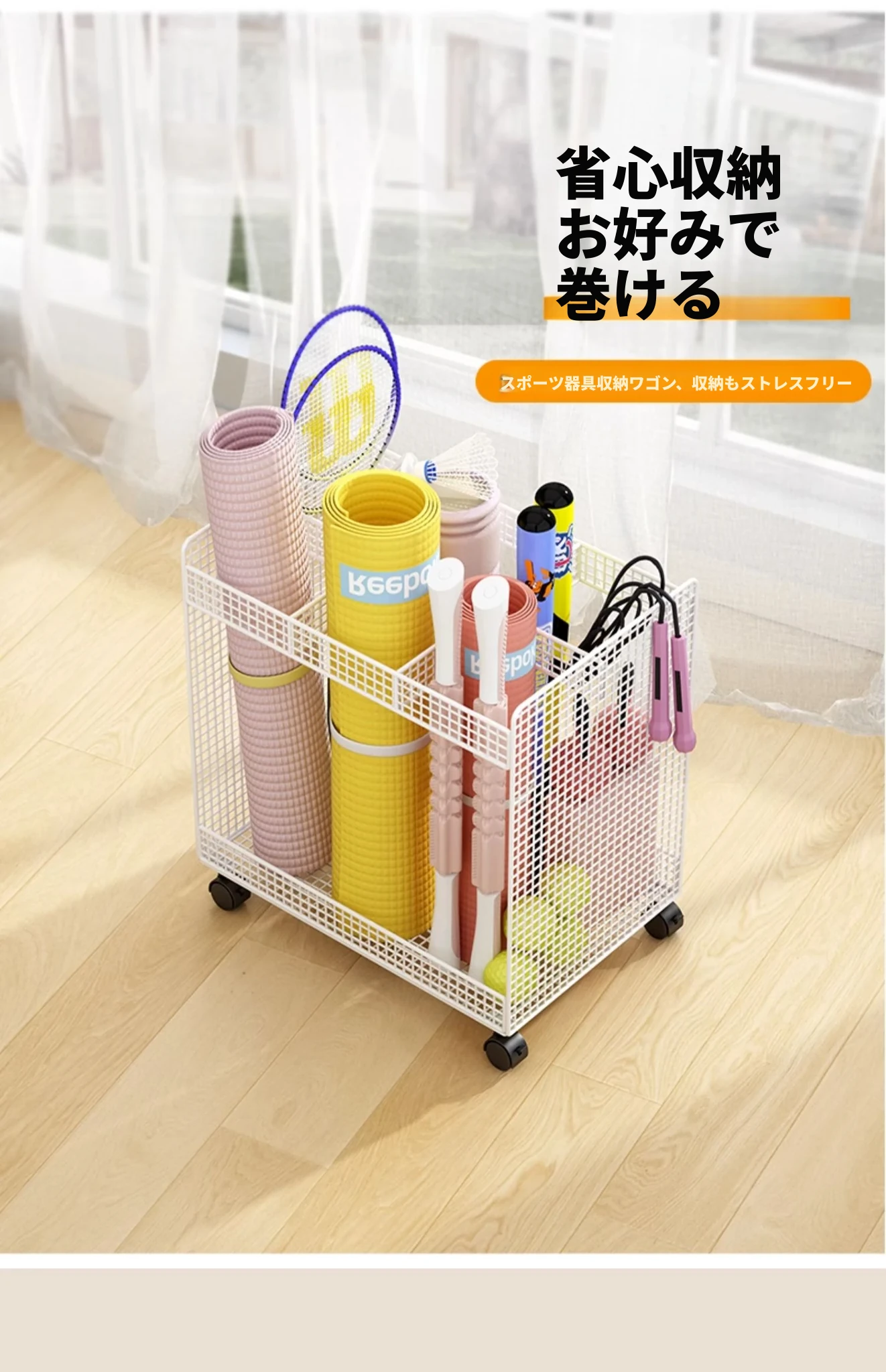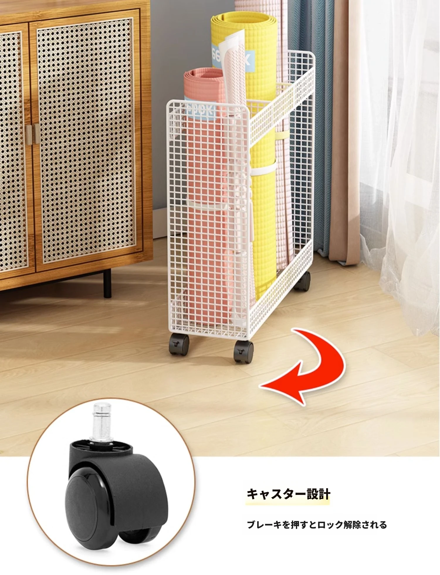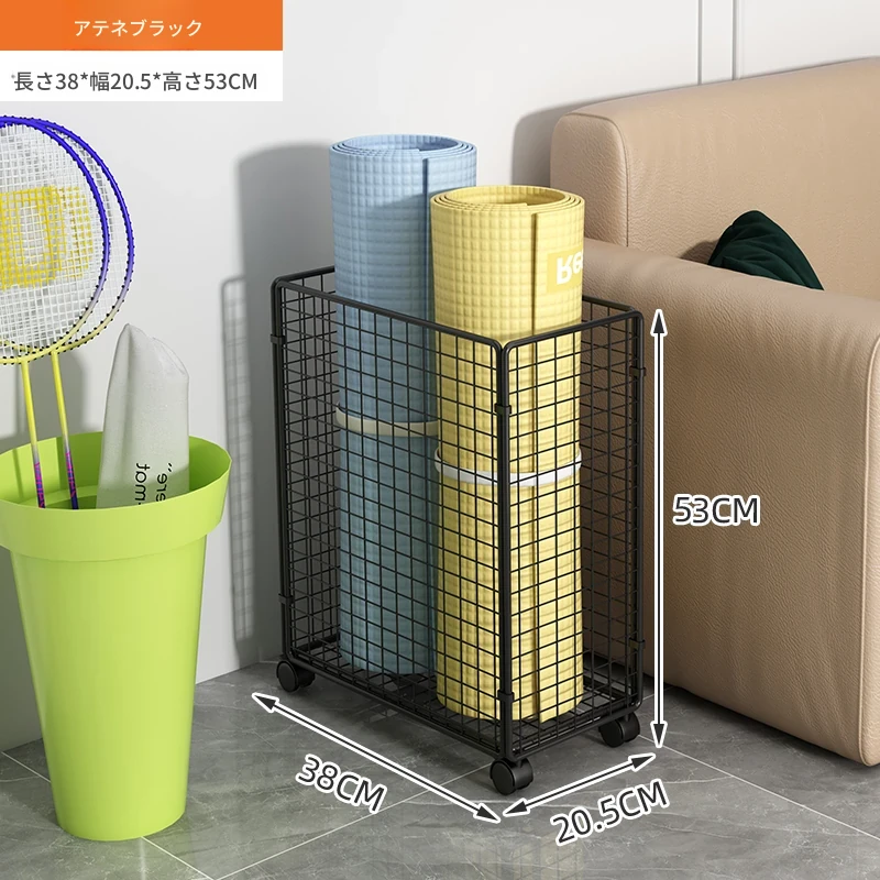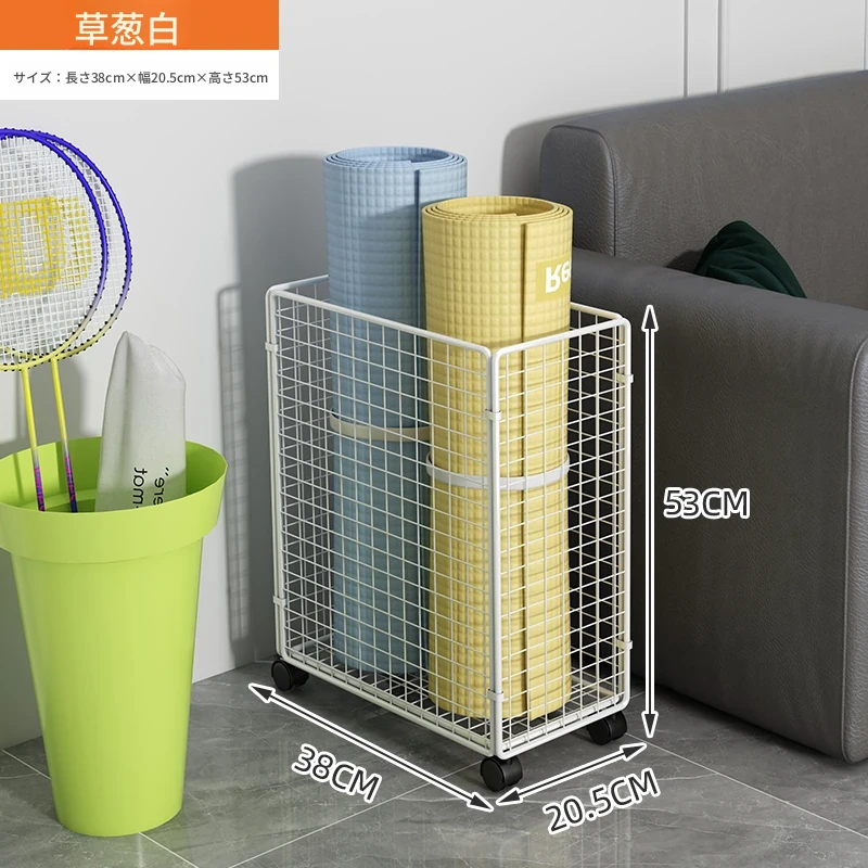 ヨガ収納バスケット 車輪付きフィットネス器具収納ラック フォームローラー用ツールバスケット 家庭用折りたたみスリム棚 すっきり整理して、快適なトレーニングスペースを実現!