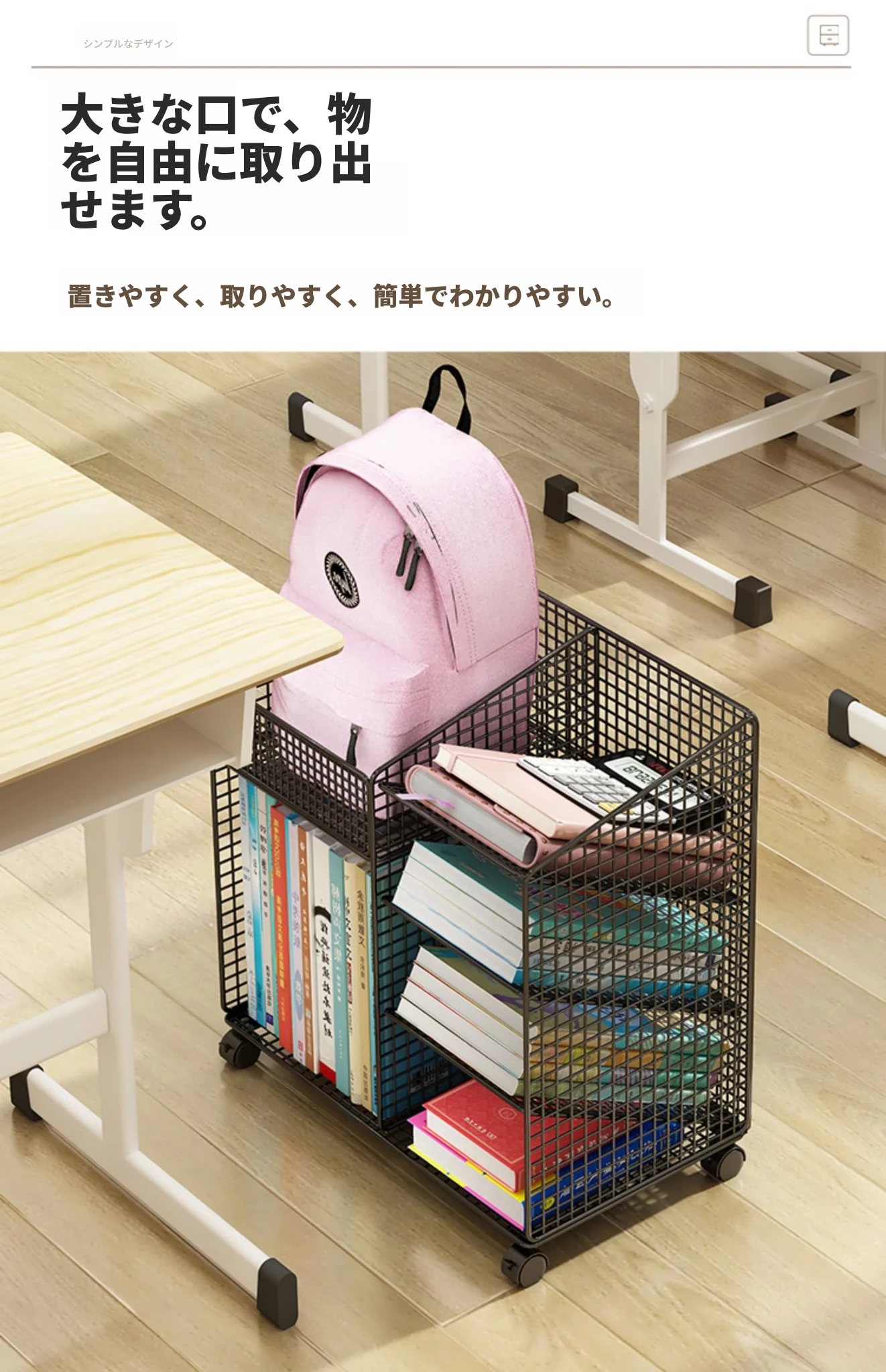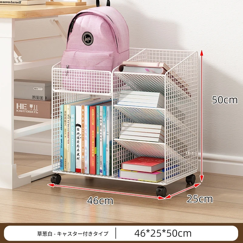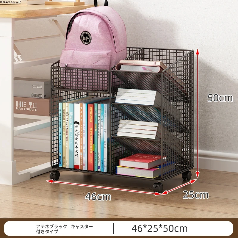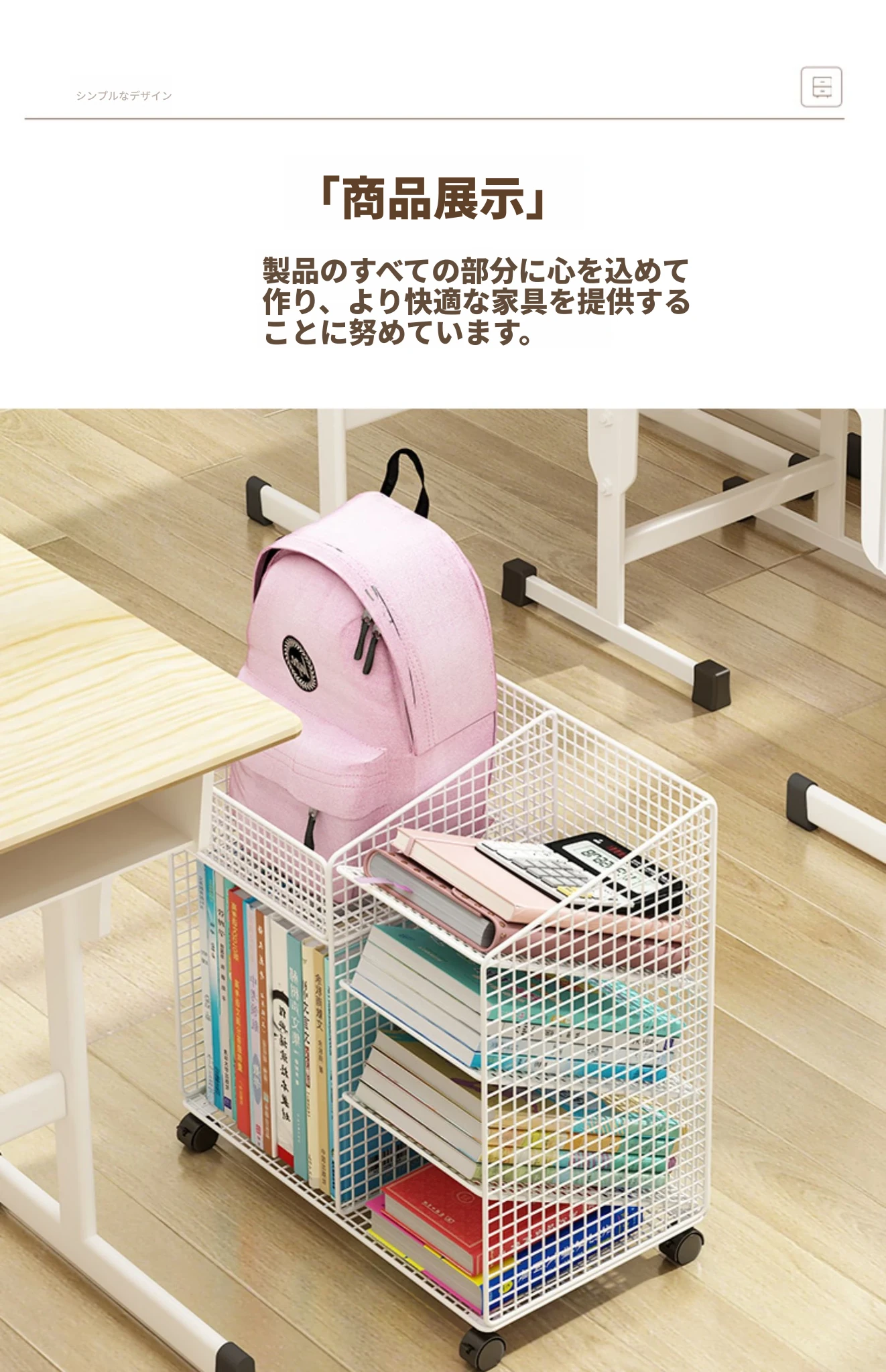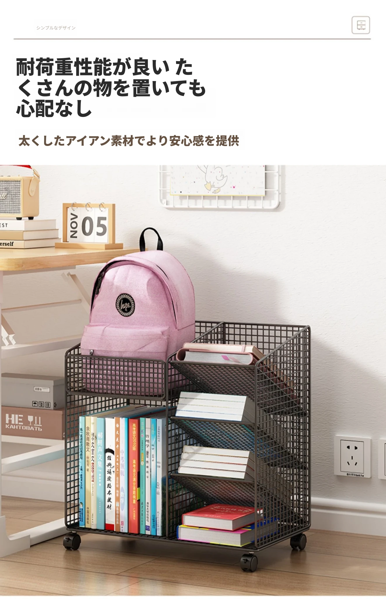 移動式書棚 - キャスター付きの便利な収納ラック!デスクサイドにぴったりな学生向け本棚。教科書やリュックサックもスッキリ整理できるコンパクトなデザイン。お部屋のインテリアにもマッチ!