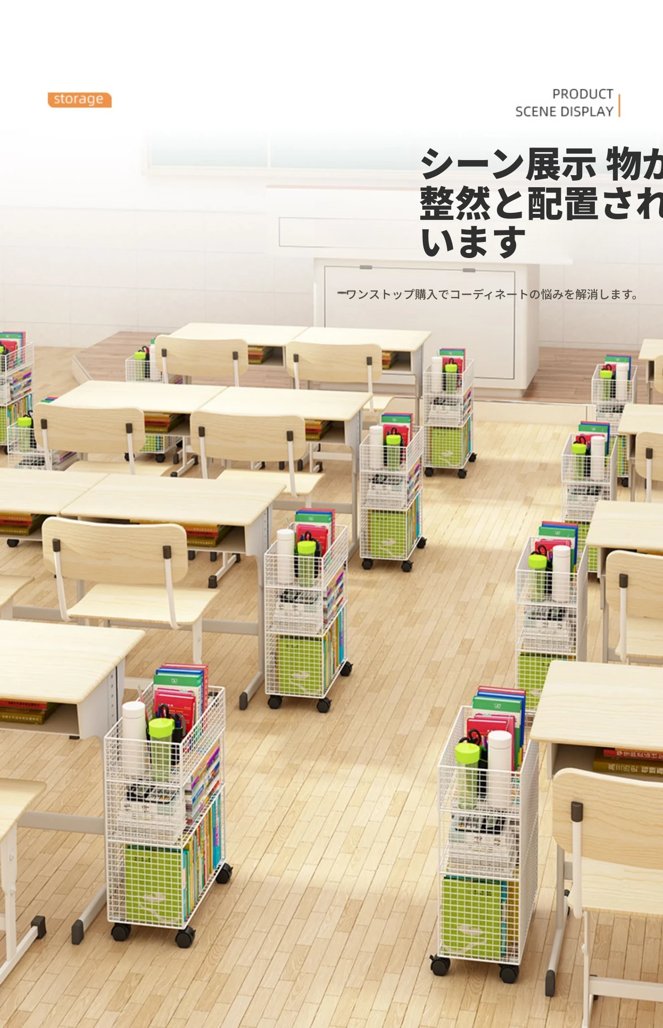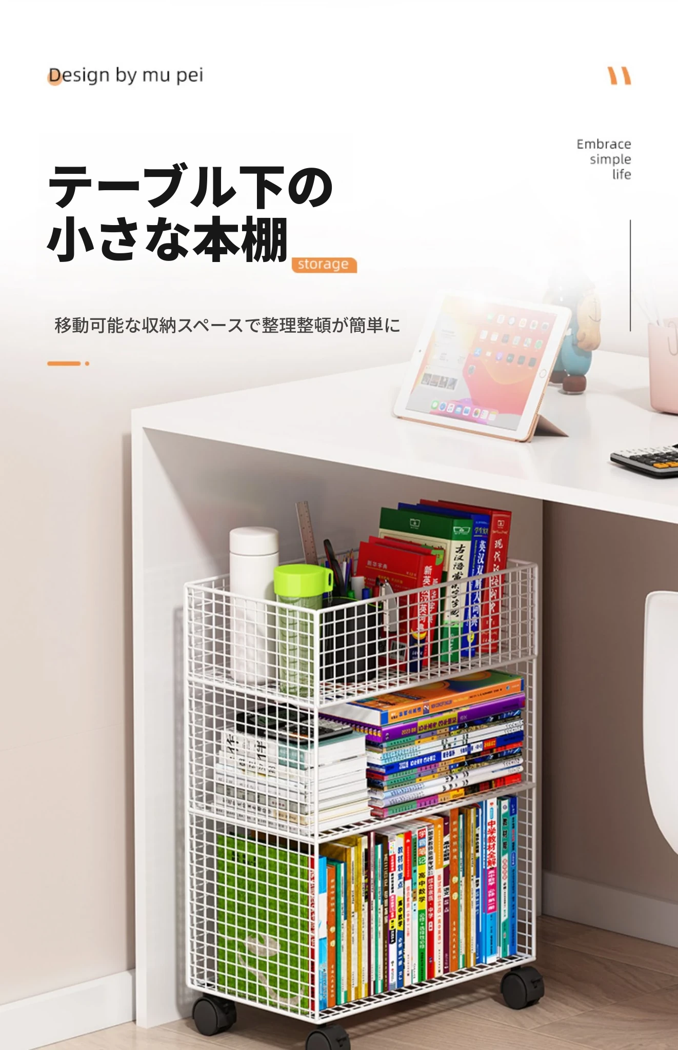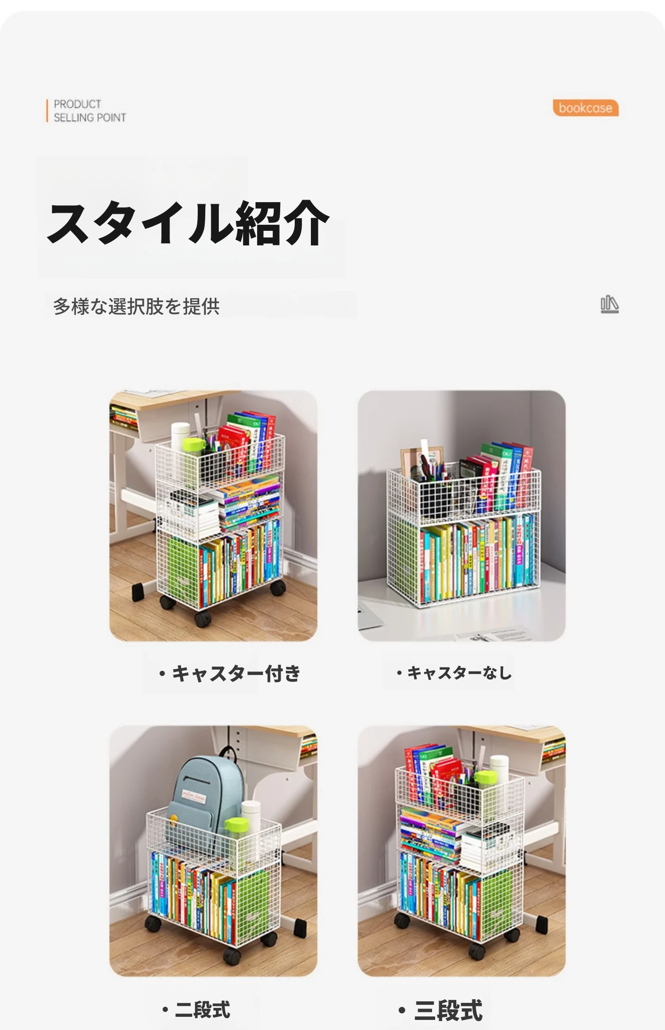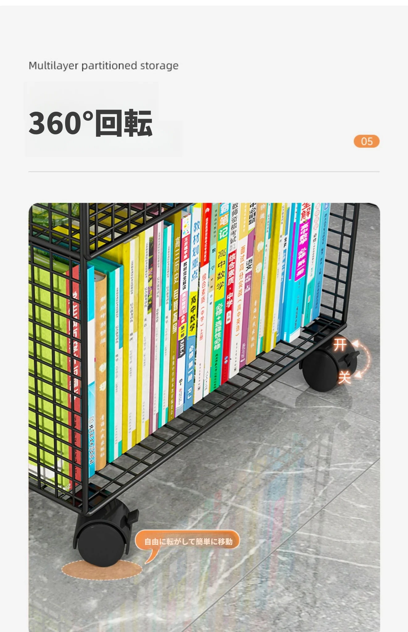 デスク下移動式ブックシェルフ - キャスター付きの収納カート!デスクサイドや教室の隅にぴったり。書籍や小物をスッキリ整理し、使いやすさを追求したスタイリッシュなフロアブックキャビネット。