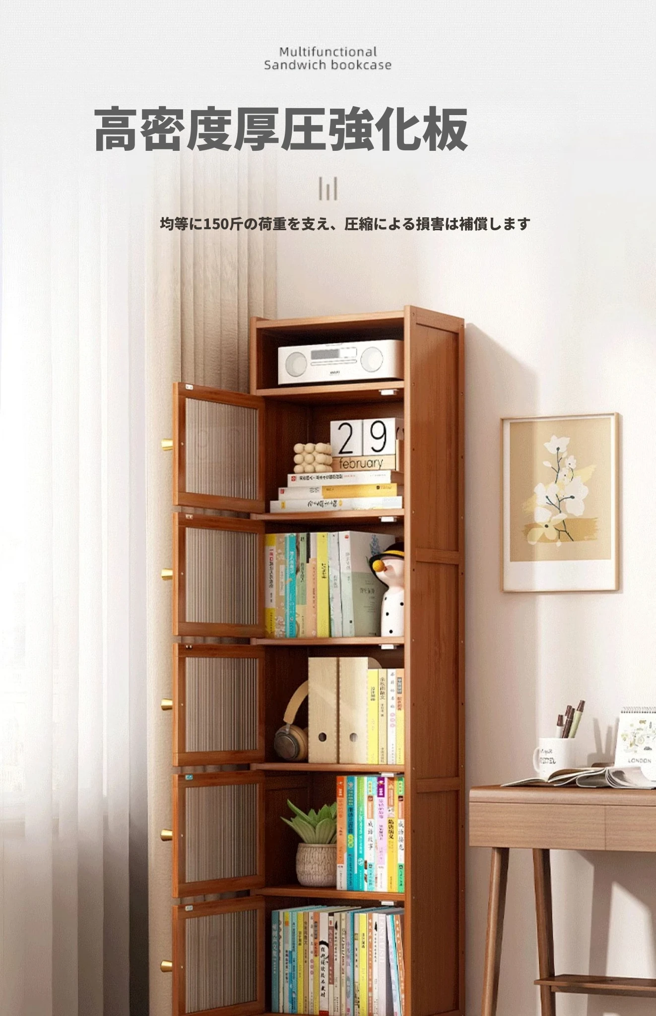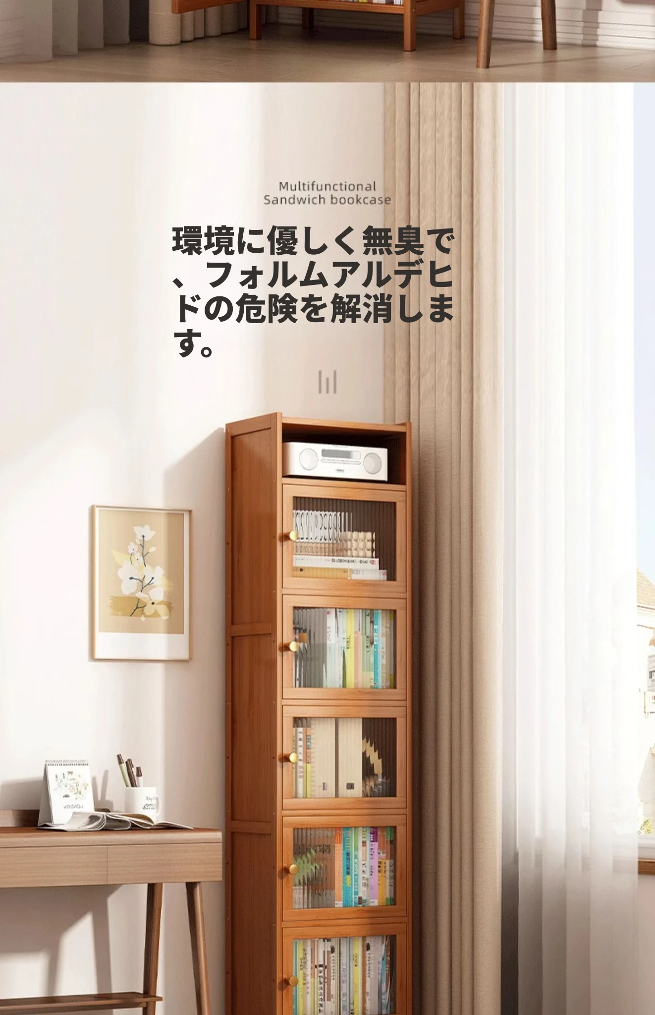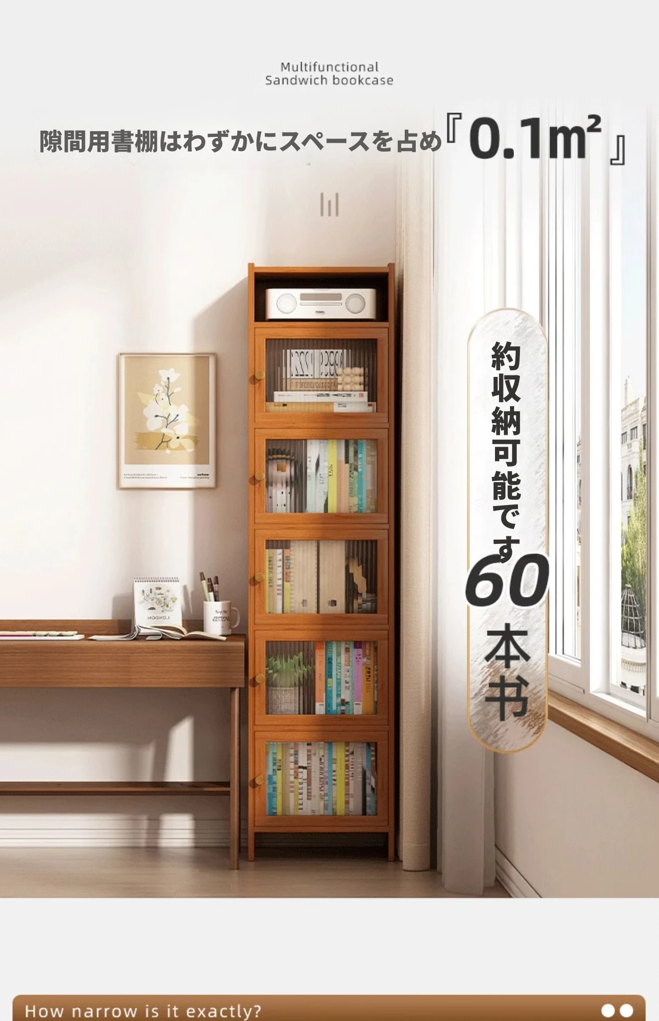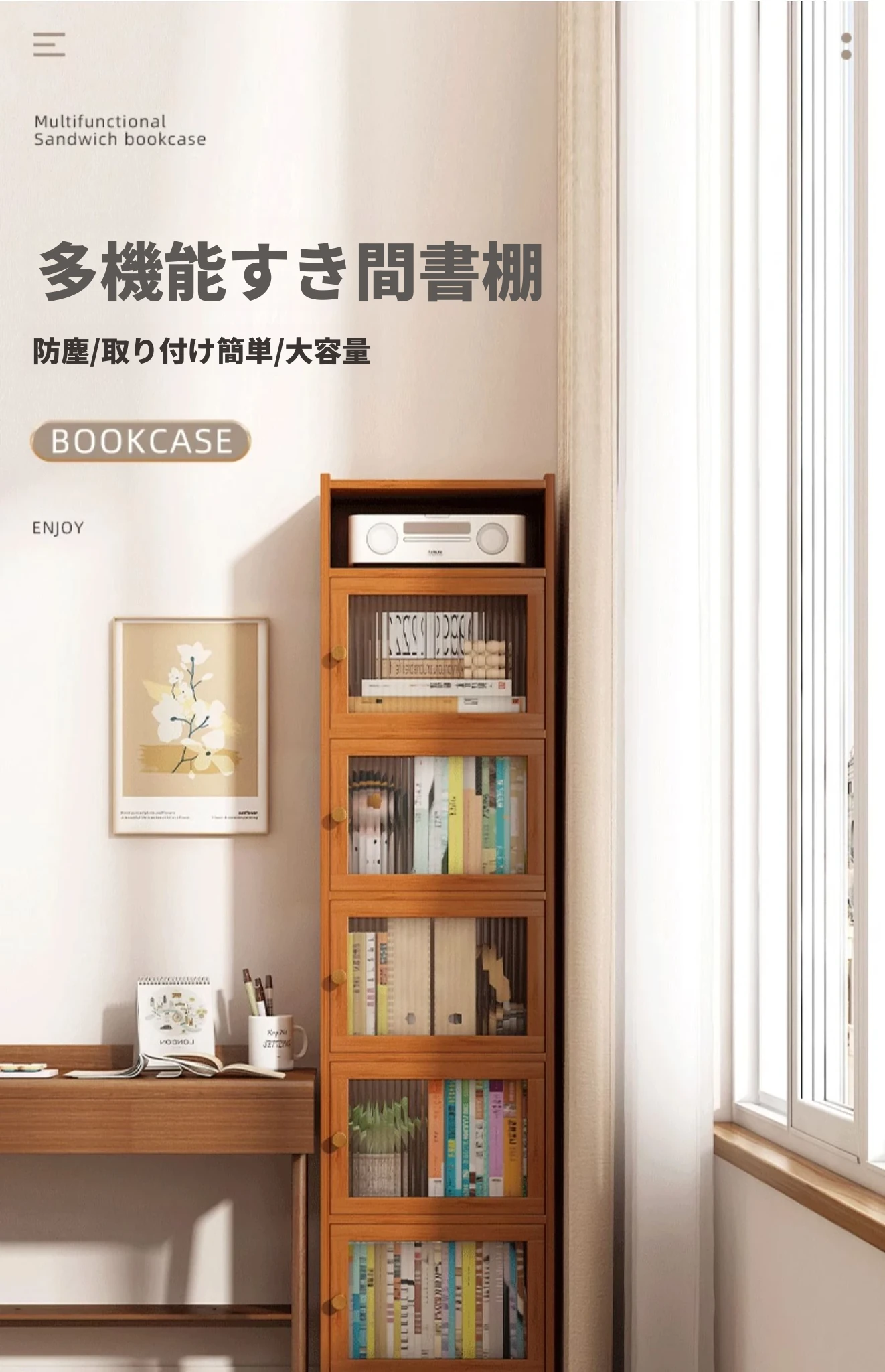 モダンシンプルな実木製書棚 - スリムなデザインで角にぴったりフィット!防塵機能付きの収納ラックで、書籍や小物をすっきり整理。お部屋にスタイリッシュなアクセントを加えます。