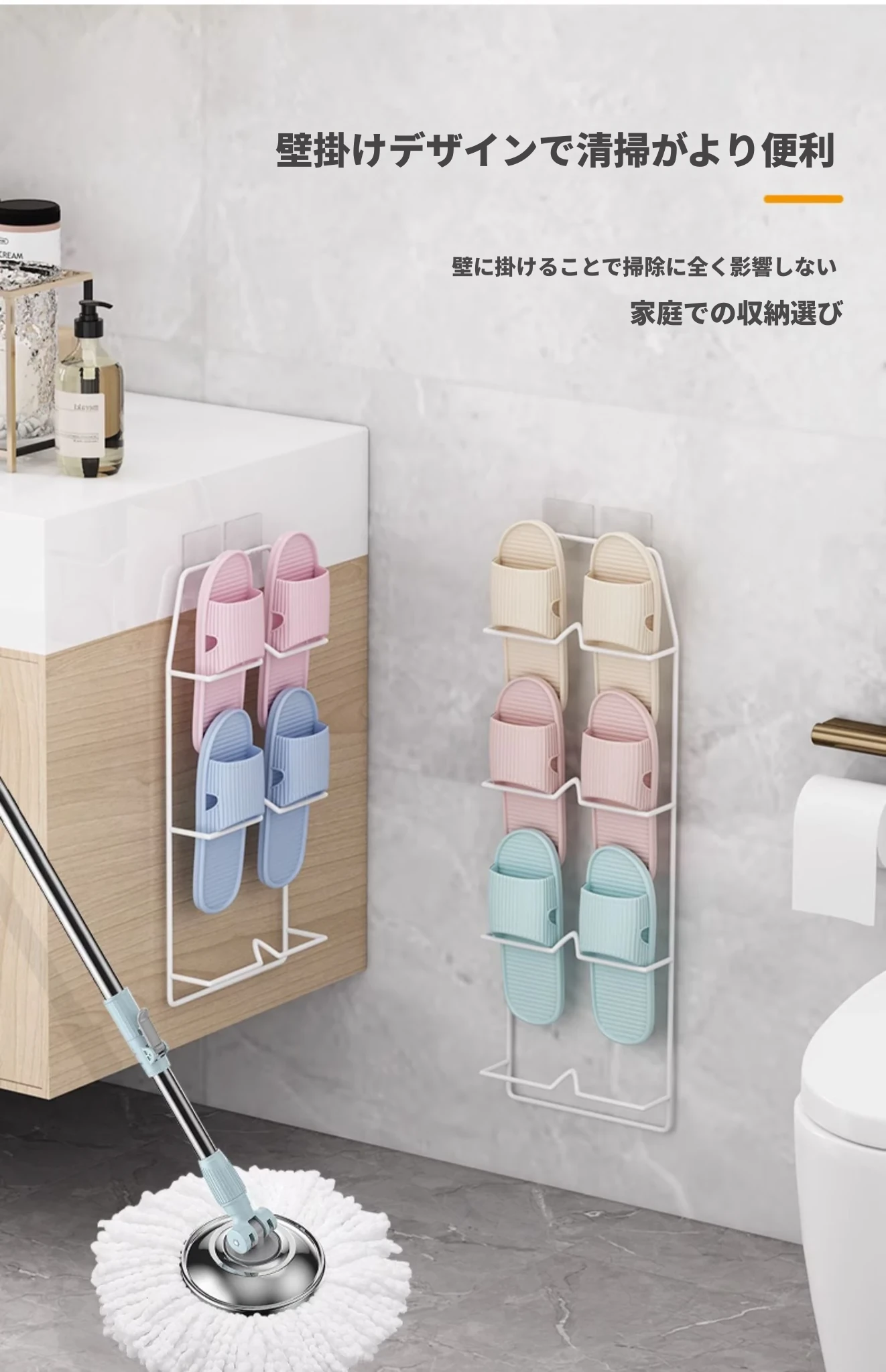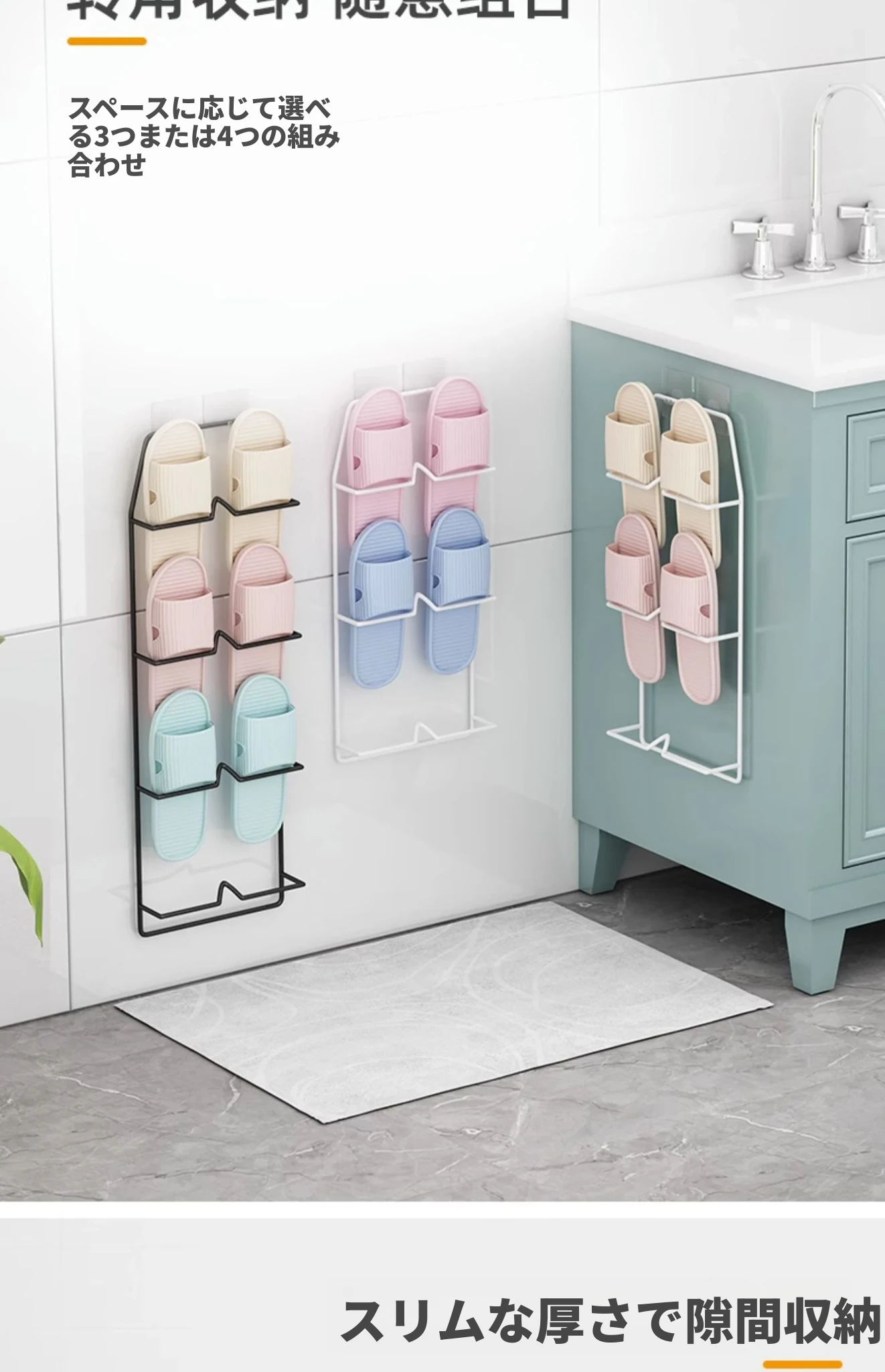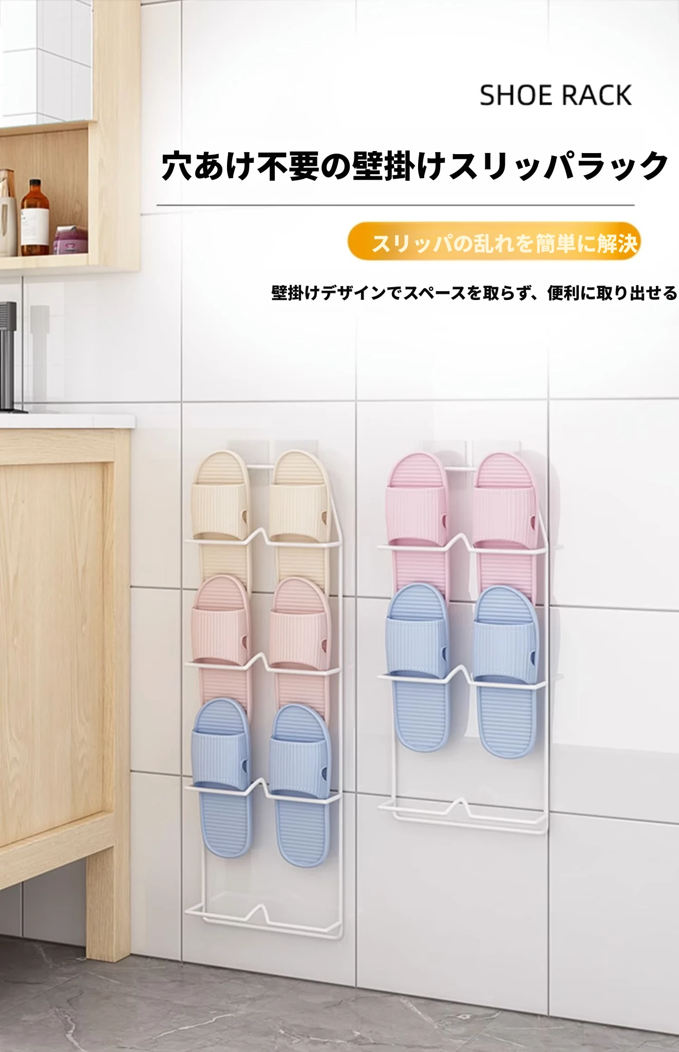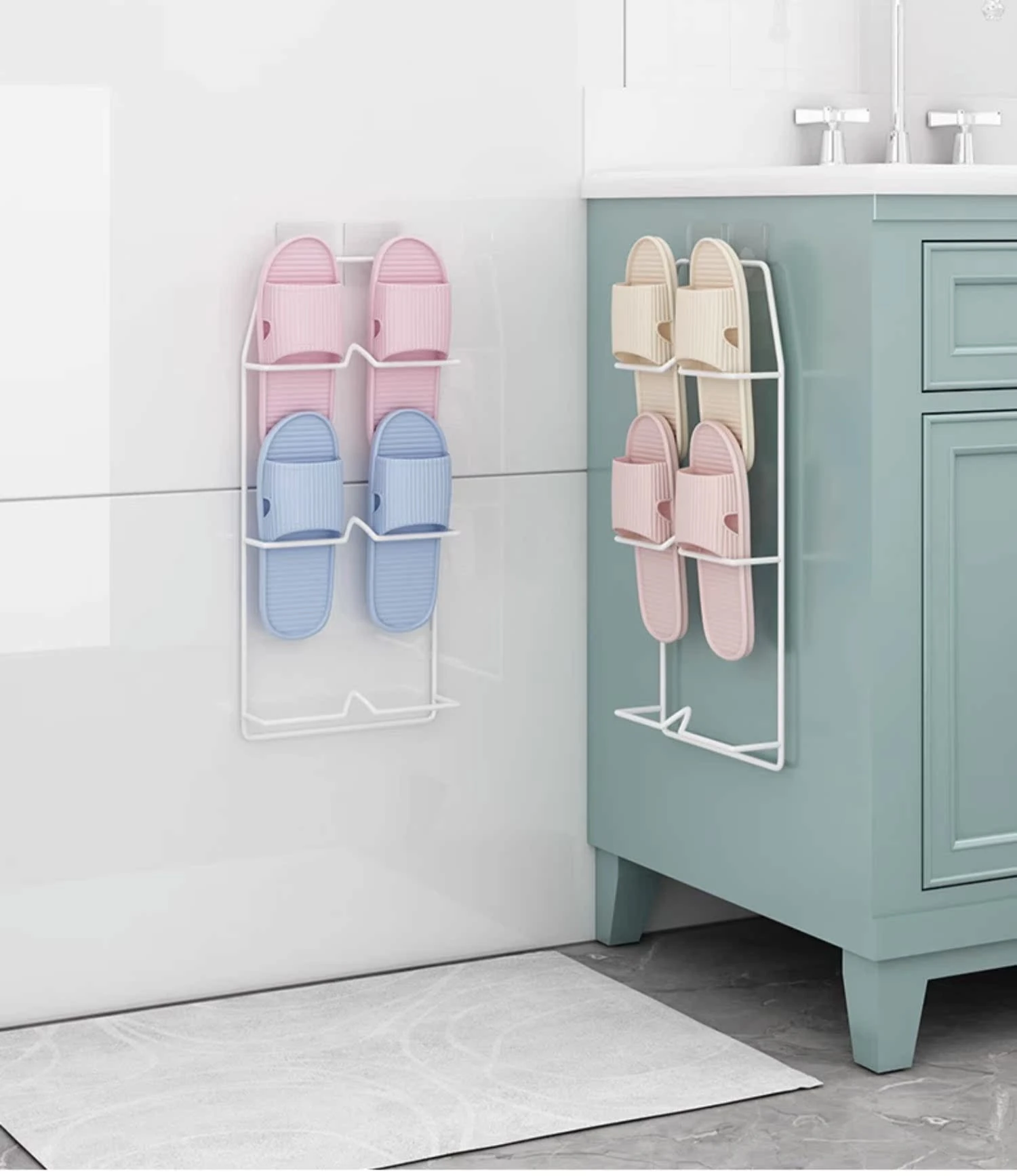 壁掛け式のバスルームスリッパラック - 穴を開けずに取り付け可能!水切り機能付きで、トイレの整理整頓を実現する靴収納の必需品!ドア裏にぴったりフィットし、スペースを有効活用します。