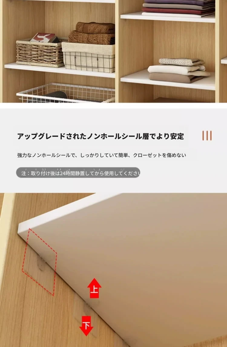 穴あけ不要!実木製のクローゼット用分割棚 - スタイリッシュで使いやすい収納革命!衣類をすっきり整理するための便利なアクティブシェルフ。