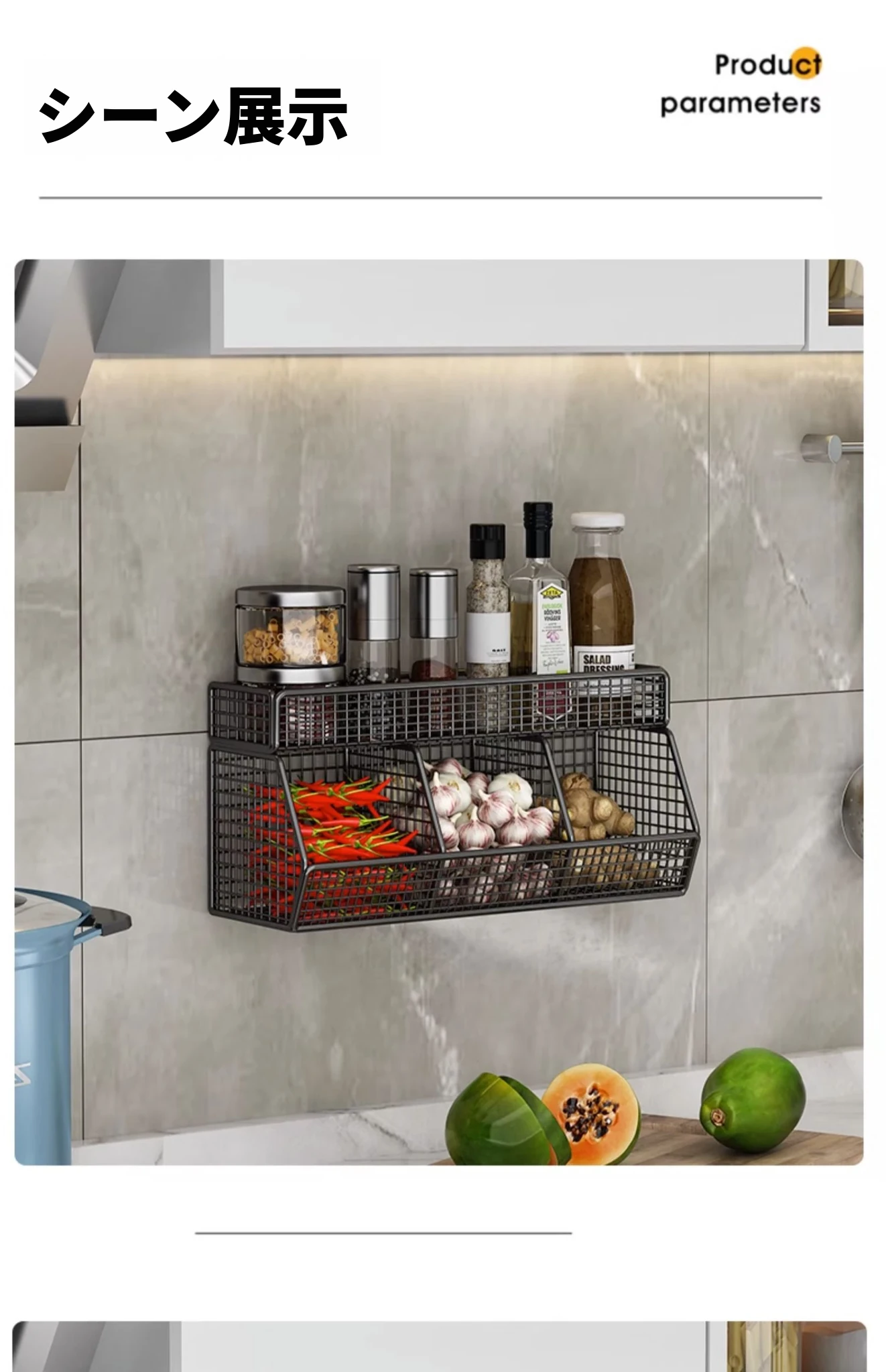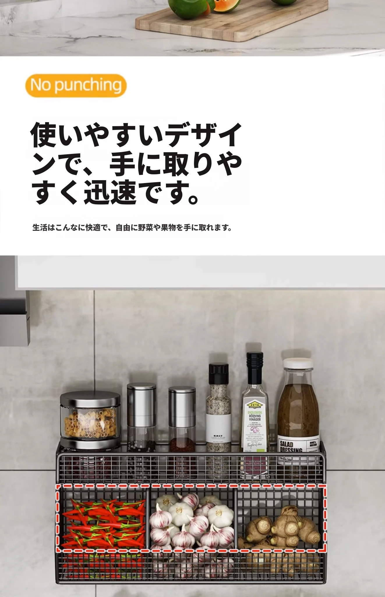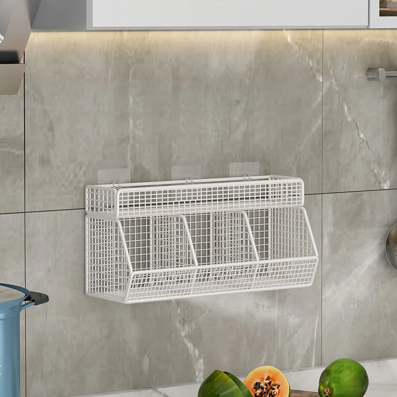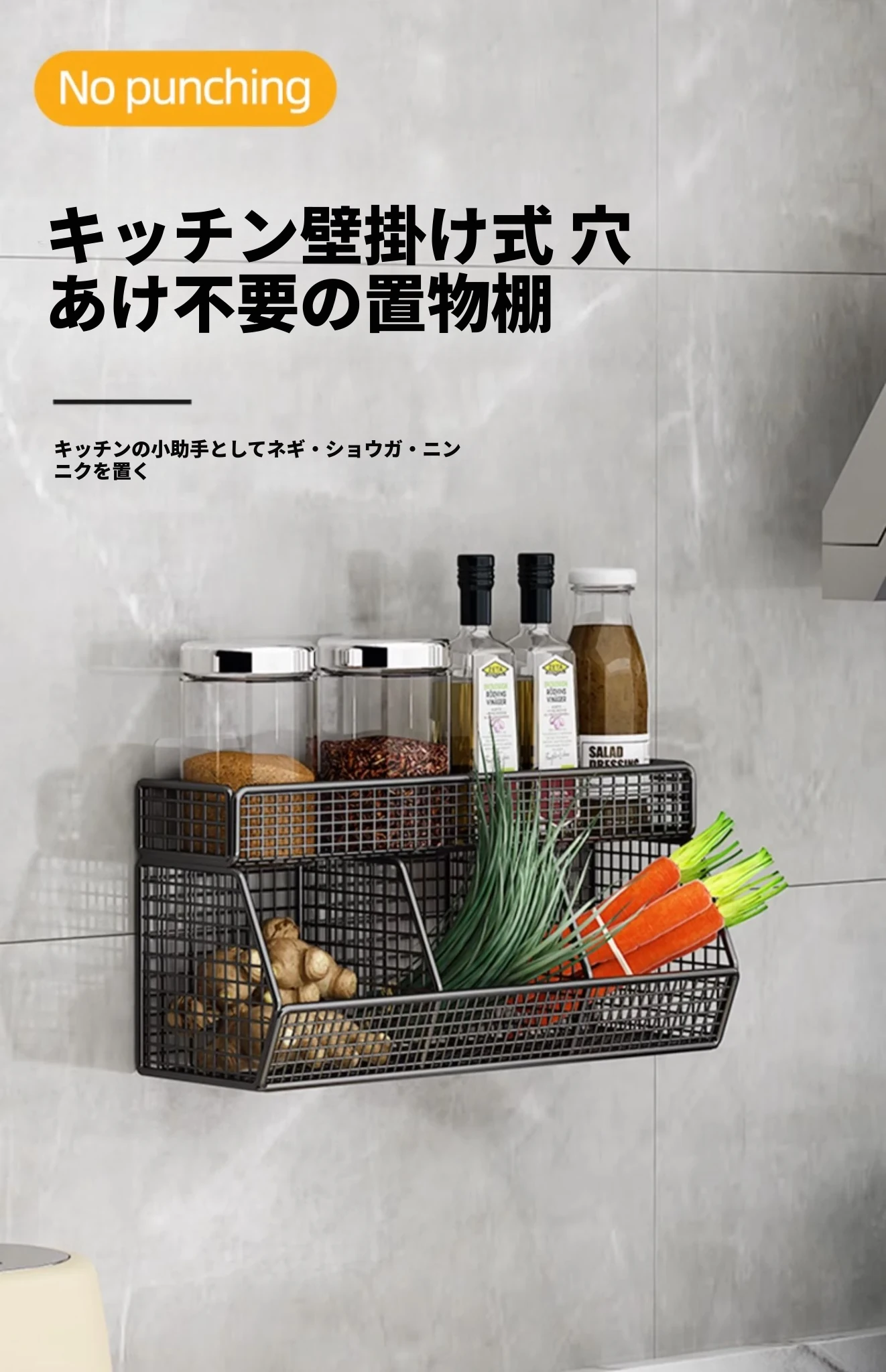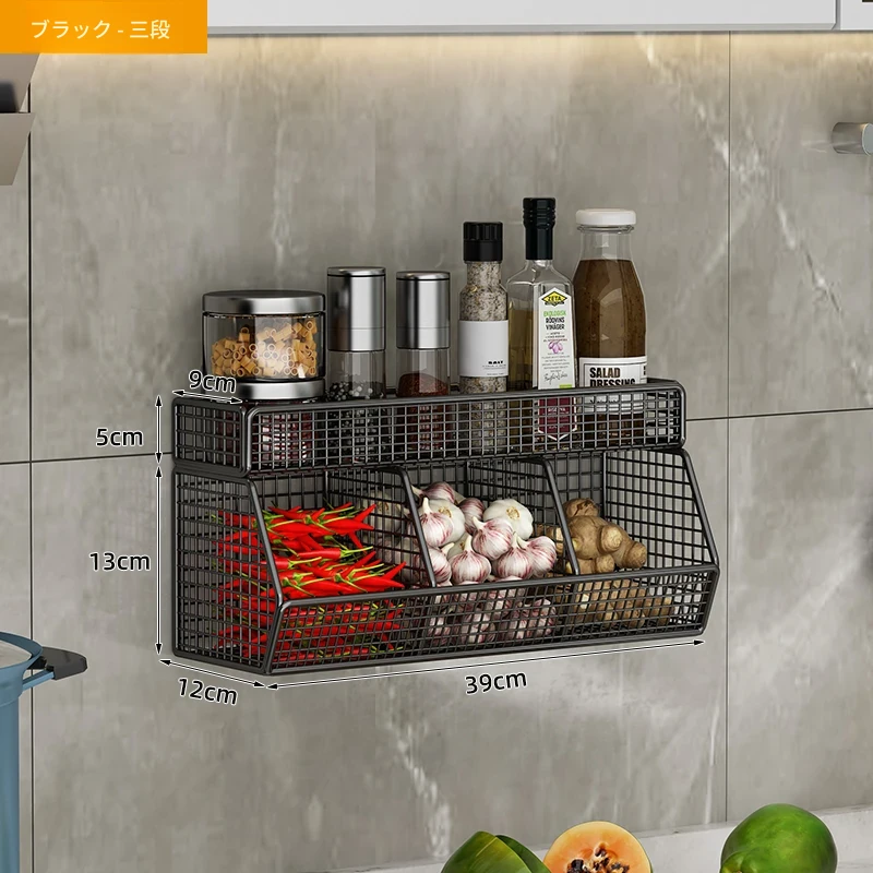 キッチン壁掛け多機能収納ラック - ネギ、生姜、ニンニク専用!壁に穴を開けずに取り付け可能な調味料ボトル収納バスケットで、整理整頓もおしゃれに!