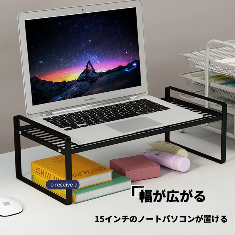 パソコンモニター昇降スタンド - ノートパソコン用デスク整理収納ラック!オフィスやホームオフィスに最適なアイテムで、作業空間をスッキリ整え、快適な姿勢をサポートします。