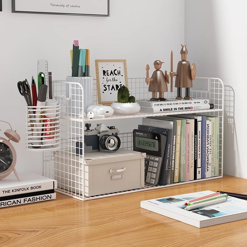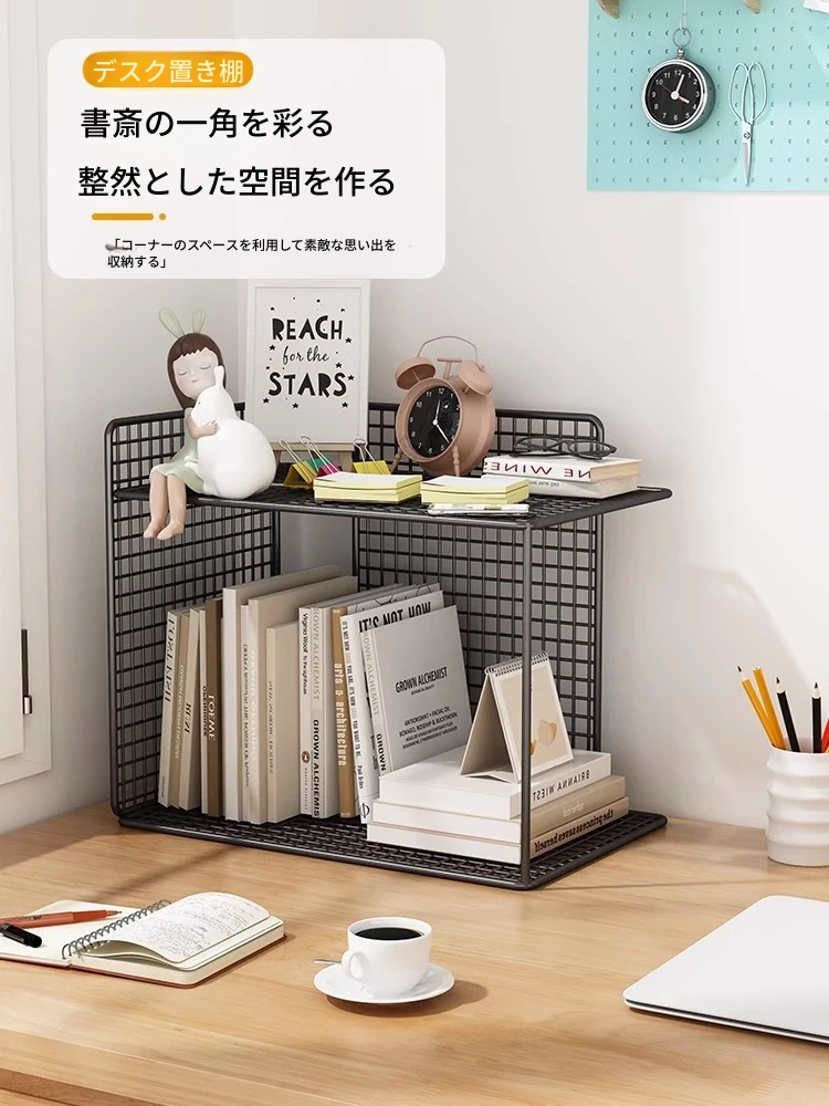 デスク用2段式書棚 - 学生に最適なシンプルな本収納ラック!オフィスや子供部屋にぴったりなアイアン製のスタイリッシュな書棚で、スッキリとしたデスク環境を実現。おしゃれで実用的な収納をお楽しみください!